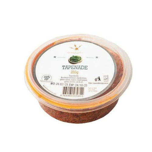 Ingredients Sundried tomatoes,black olives,green olives,capers,black pepper,garlic,lemon,salt & oil.